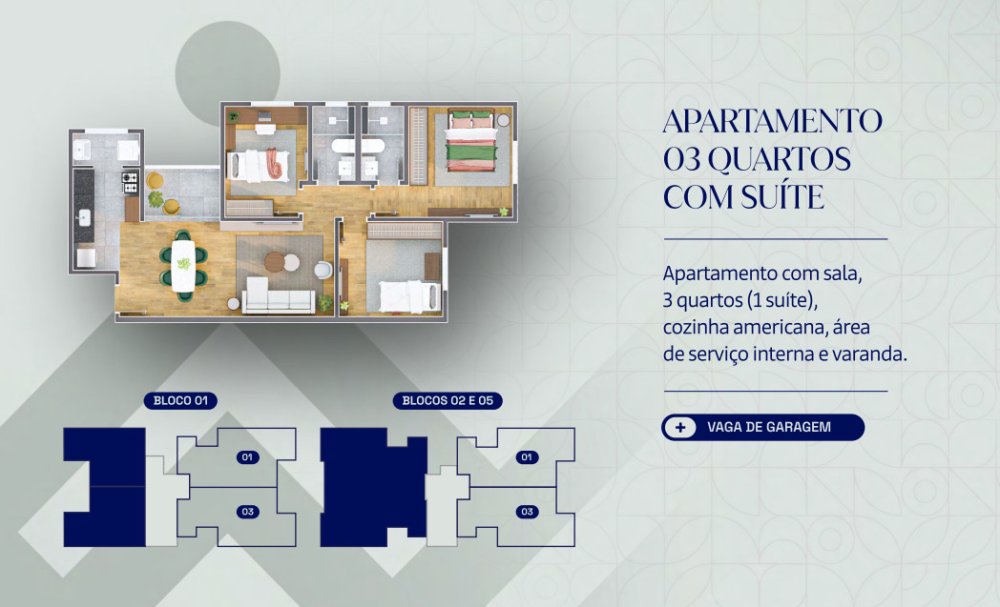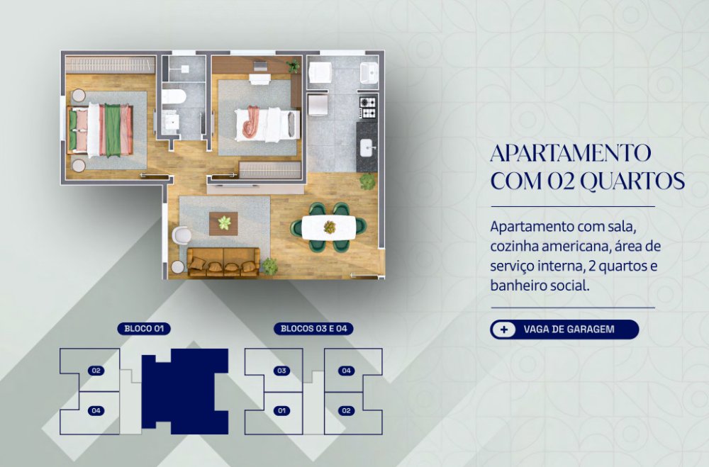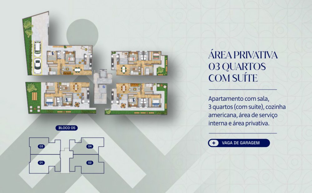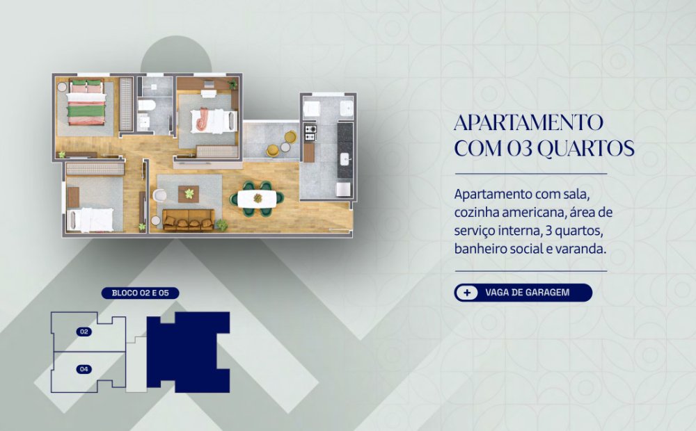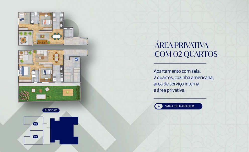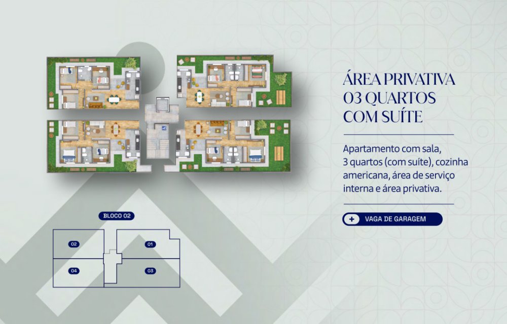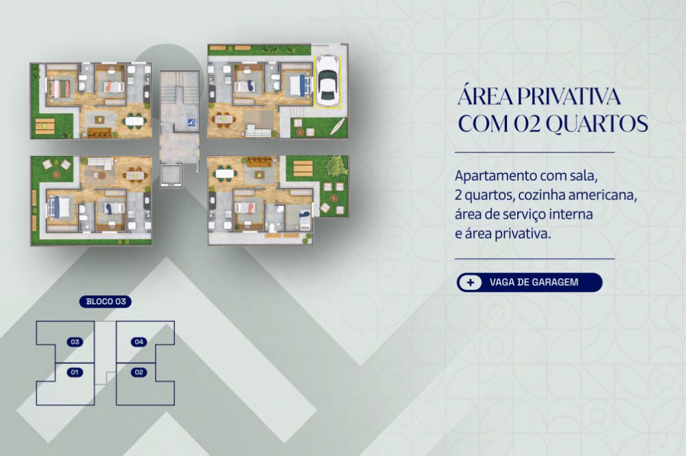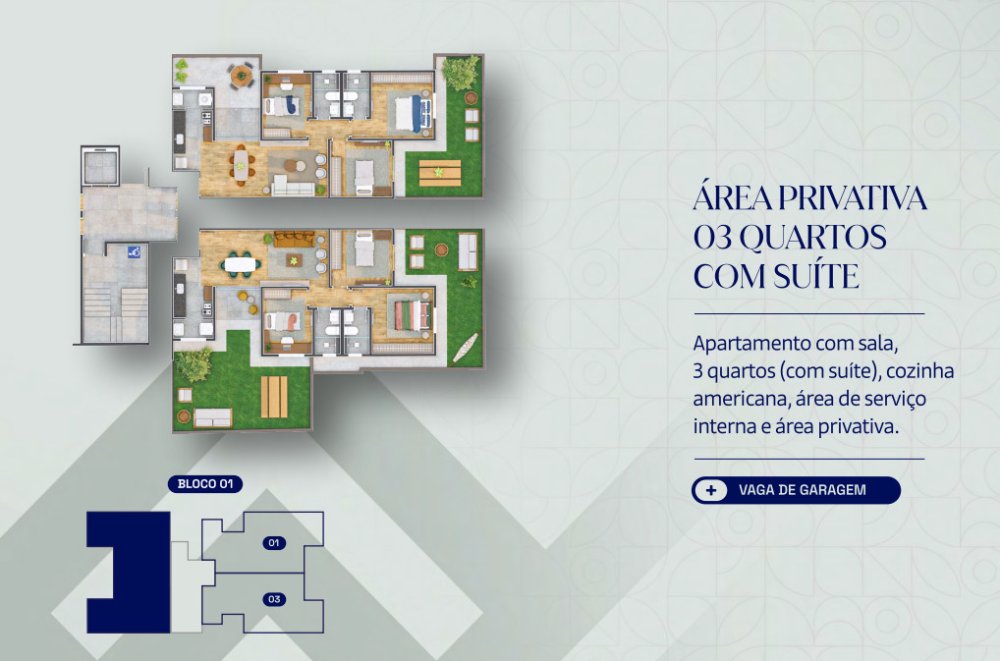 Com opções de apartamentos de 2 ou 3 quartos, escolha entre unidades com área privativa em térreo ou desfrute de vistas deslumbrantes em coberturas exclusivas.