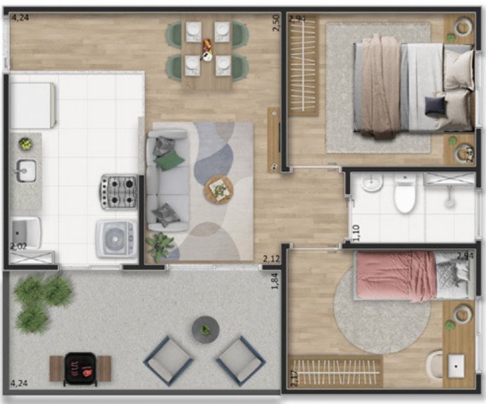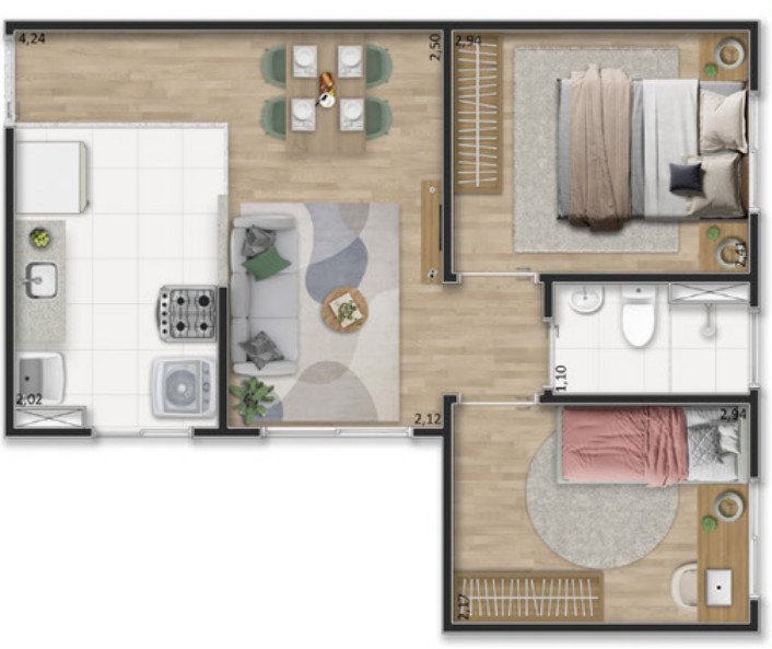 Os apartamentos foram planejados para unir funcionalidade e conforto, com piso laminado de madeira na sala e nos quartos, bacia sanitária com duplo acionamento, bancada e cuba da cozinha em mármore sintético, torneiras com arejador e redutor de vazão e área de serviço com tanque em mármore sintético, além da opção de unidades com área privativa, ideais para quem busca mais espaço e liberdade.